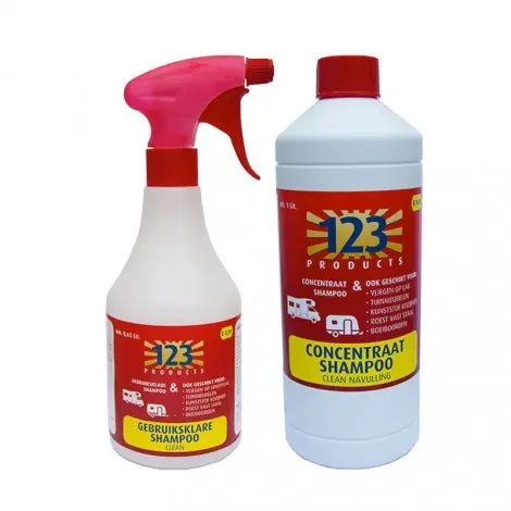 Deze Clean Shampoo van 123 Products is een krachtige, sterk reinigende shampoo voor het reinigen van caravans en campers. Het Clean schoonmaakmiddel wordt gebruikt voor het schoonmaken van zowel het exterieur als het interieur van uw voertuig. Het verwijdert onder andere vuil, hars, alg, vliegen en remstof. Clean shampoo heeft geen geur- of kleurstoffen en is voor meer dan 95% biologisch afbreekbaar.