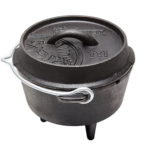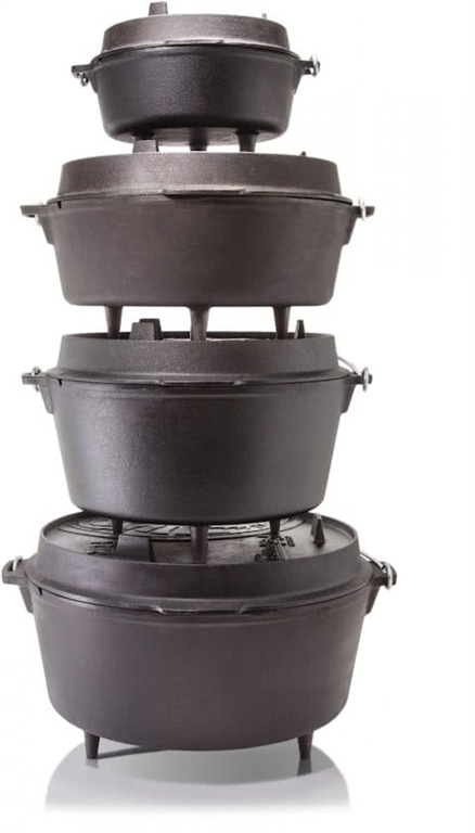 Een traditionele en multifunctionele gietijzeren pan. Deze Dutch Oven is uitermate geschikt voor het bereiden van maaltijden boven open vuur of op hete kolen. Het massieve gietijzer verdeelt de warmte zodat de pan zonder problemen kan worden gebruikt om te bakken, braden, frituren, koken of stoven. De pan is voorzien van een 'pre-seasoned' coating tegen aanbakken en roesten. Kan tevens worden gebruikt als oven door gloeiende houtskoolbriketten op het deksel en om de pan te plaatsen. Het deksel is voorzien van 3 kleine pootjes en een opstaande rand. Zo kan het deksel tevens worden gebruikt als koekenpan, hapjespan of als schaal. Aan de onderkant bevinden zich eveneens 3 pootjes zodat de pan stabiel in het vuur kan worden geplaatst. Voorzien van een kleine opening voor gebruik van een thermometer en een hengsel om de pan op te hangen aan de Cooking driepoot. Afmetingen (Øxh): 25x16 cm. Inhoud: 2,3 Liter.
