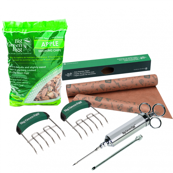 1. Chef’s Flavor Injector: Maak je vlees en gevogelte nog sappiger op unieke wijze2. Wood Chips Apple: Geef je gerecht een karakteristiek rokerige, zoete smaak3. Butcher Paper: Pak je vlees in voor een mals resultaat4. Meat Claws: Trek makkelijk je langzaam gegaarde vlees uit elkaar.