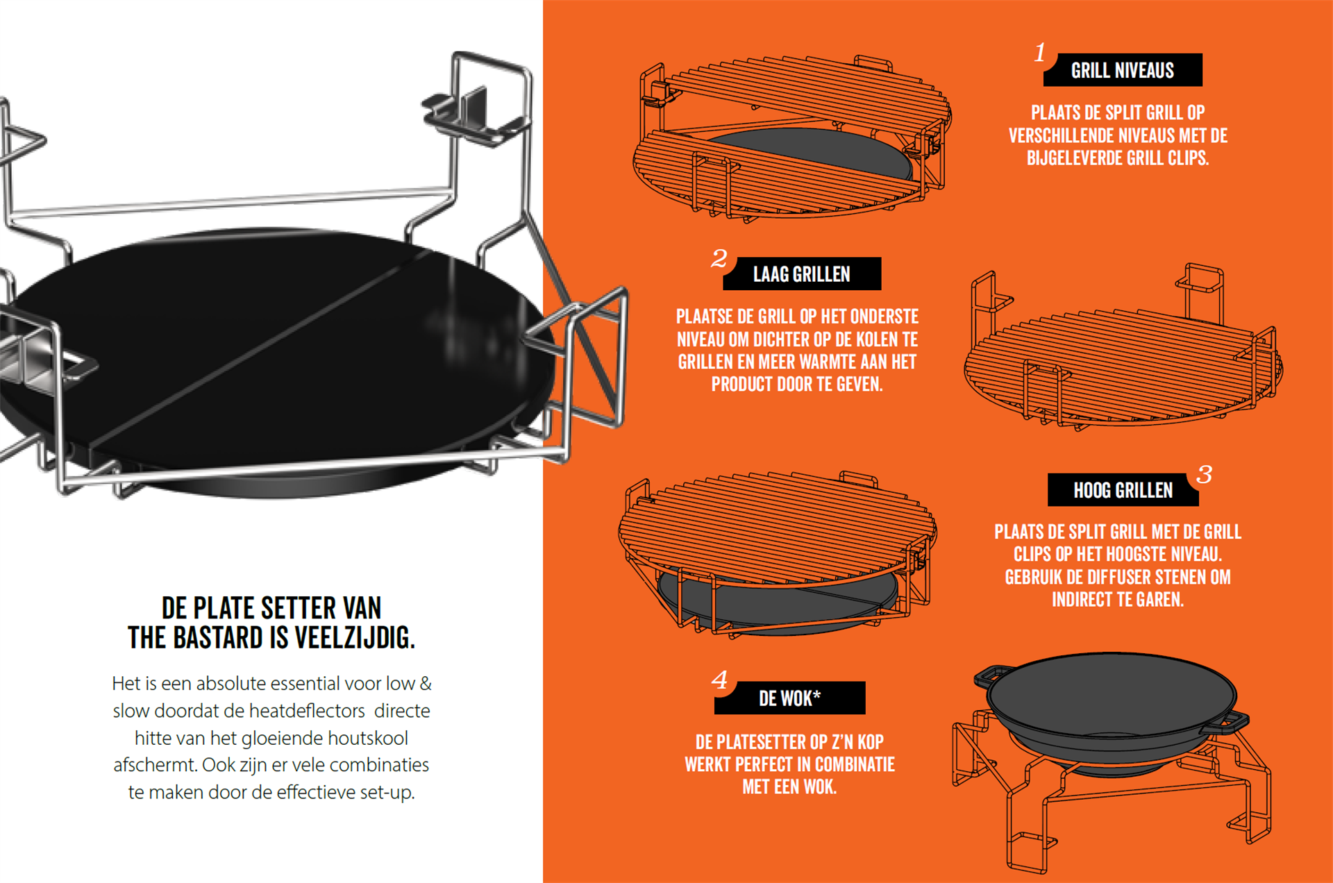 The Stand! Wij hebben onze platesetter zo ontworpen dat hij een dubbele functie heeft als panhouder. Draai het frame ondersteboven en je bent klaar voor het serieuzere directe werk. Onder andere te gebruiken met onze Phantom Steel Wok, Dutch Oven of Paella Pan.