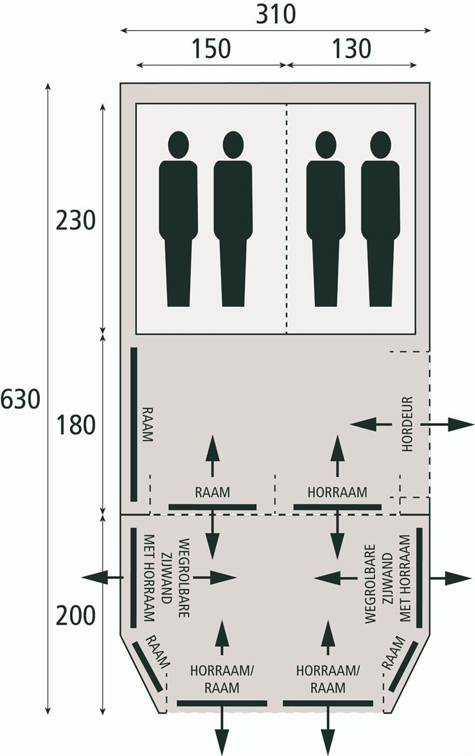 Een grote leefruimte van 180 bij 310 cm zit verbonden aan een luifel van 200 bij 310 cm met een tussenwand die weg te ritsen is. De zijwanden en voorwand onder de luifel kunt u oprollen voor extra ventilatie bij warme dagen. De slaapcabines zijn op te delen in twee losse ruimtes voor maximaal twee persoon per ruimte óf één grote royale slaapkamer voor maximaal vier personen.