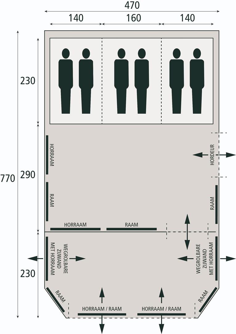 Deze luxe Bardani familietent bestaat uit een leefruimte van 290 bij 470 cm, die u verder kunt uitbreiden met een luifel van 230 bij 470 cm. U kunt deze ruimte naar wens indelen, omdat de zijwanden van de luifel wegrolbaar en de voor- en tussenwand uitritsbaar zijn. De drie slaapcabines van 230 bij 140 cm of 230 bij 160 cm kunnen samengevoegd worden tot één royale slaapkamer van 230 bij 440 cm.