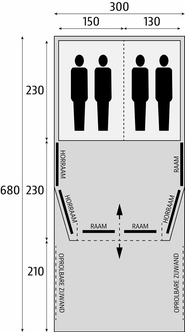 De AirWave 300 Deluxe TC heeft een leefruimte van 230 bij 300 cm die u met een aanritsbare luifel verder kunt vergroten met 210 bij 300 cm. Dankzij de rechte wanden kunt u hier makkelijk keukenkastjes in kwijt, evenals campingstoelen en een tafel. De twee slaapcabines zijn voorzien van een wegritsbare scheidingswand, zodat u ze samen kunt voegen of als aparte slaapcabines kunt gebruiken. Daarnaast zijn de voor- en zijwanden van de luifel oprolbaar, zodat u een overkapping kunt creëren.