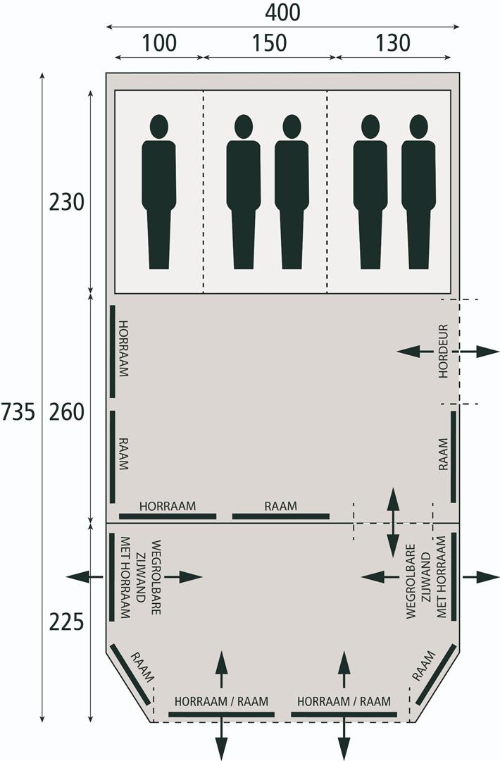 Geniet in een grote leefruimte van 260 bij 400 cm die doorloopt in een ruime luifel van 225 bij 400 cm. De grote ruimtes met rechte wanden bieden genoeg plek voor een eventueel kooktoestel, tafel en stoelen. Aan de achterzijde bevinden zich drie slaapcabines met een breedte van 100, 150 en 130 cm. Dankzij een lengte van 230 cm kunt u in deze slaapcabines heerlijk uitgestrekt liggen.