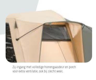 De binnentent is gemaakt van zeer ademend en technisch katoen, zodat de temperatuur in de tent altijd zeer aangenaam blijft. Bovendien is dit katoen ook verduisterend, zodat u een nog betere nachtrust ervaart.