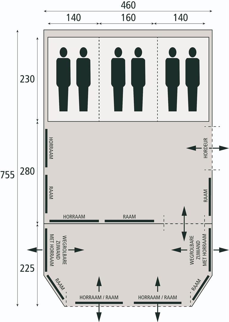 Met een grootte van 755 bij 460 cm biedt deze Bardani tunneltent veel ruimte en comfort. De leefruimte is 280 bij 460 cm en de luifel voegt daar nog eens 225 bij 460 cm aan toe. De drie extra lange 230 cm slaapcabines zijn aan links en rechts 140 cm breed en in het midden 160 cm. Vanwege de wegrolbare zijwanden, tussenwand en voorwand kunt u de tent indelen zoals u het zelf fijn vindt.