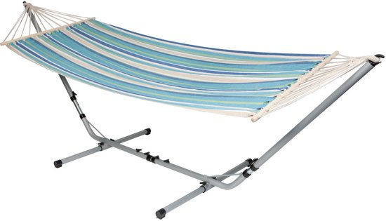 Een vrolijke en stevige hangmat. Heerlijk ontspannen op vakantie, in de tuin of op het balkon. Gemaakt van stevig 320gr/m² katoen/polyester. De hangmat beschikt over een spreidstok aan de uiteinden waardoor de stof volledig open blijft.