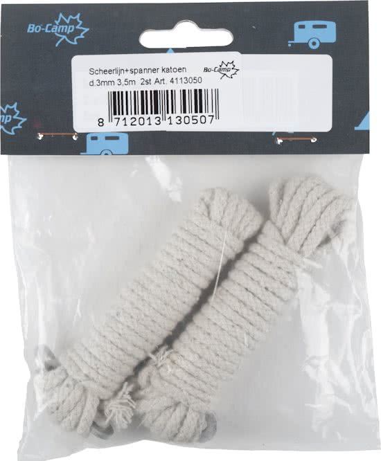 Een set van 2x 3,5 meter scheerlijn met 2 spanners. Dit scheerlijnkoord is gemaakt van natuurlijk katoen. Voorkomt sporen en/of vlekken op de tent. Eenvoudig af te spannen met de 2 bijbehorende aluminium spanners.