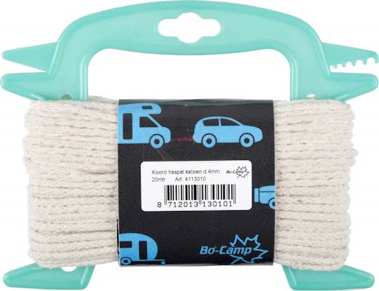 Scheerlijn van 20 meter op een haspel. Dit scheerlijnkoord is gemaakt van natuurlijk katoen. Voorkomt sporen en/of vlekken op de tent.