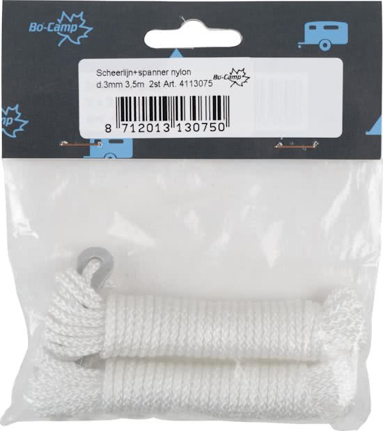 Een set van 2x 3,5 meter scheerlijn met 2 spanners. Dit scheerlijnkoord is gemaakt van sterk en duurzaam nylon. Krimpt of rekt niet onder invloed van regen en/of zon. Eenvoudig af te spannen met de 2 bijbehorende aluminium spanners.
