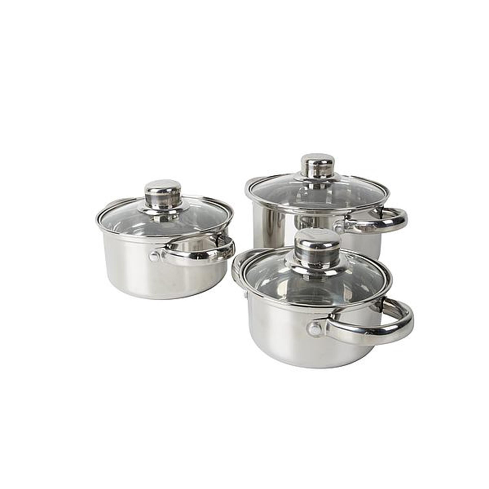 Een 3-delige RVS camping pannenset. Iedere pan beschikt over een stevig glazen deksel. Deze smalle en lage pannen zijn bij uitstek geschikt voor de beperkte ruimte op gaskomforen. Te gebruiken op de warmtebronnen gas, keramisch en elektrisch.