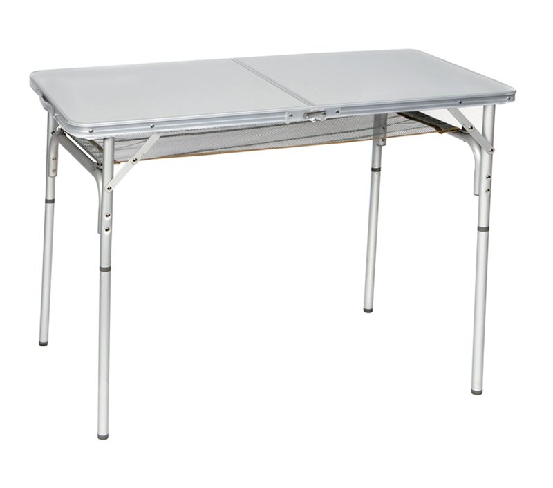 Zeer mooie en praktische campingtafel van Bo-Camp gemaakt van aluminium en daarom licht in gewicht. De campingtafel is voorzien van een watervast en hittebestendig blad en er zit een handig net onder het tafelblad om spullen uit zicht, maar wel altijd bij de hand, op te ruimen. Door de verstelbare en afneembare poten kan de tafel heel fijn afgesteld worden. Op te ruimen en vervoeren als koffermodel (met handgreep).