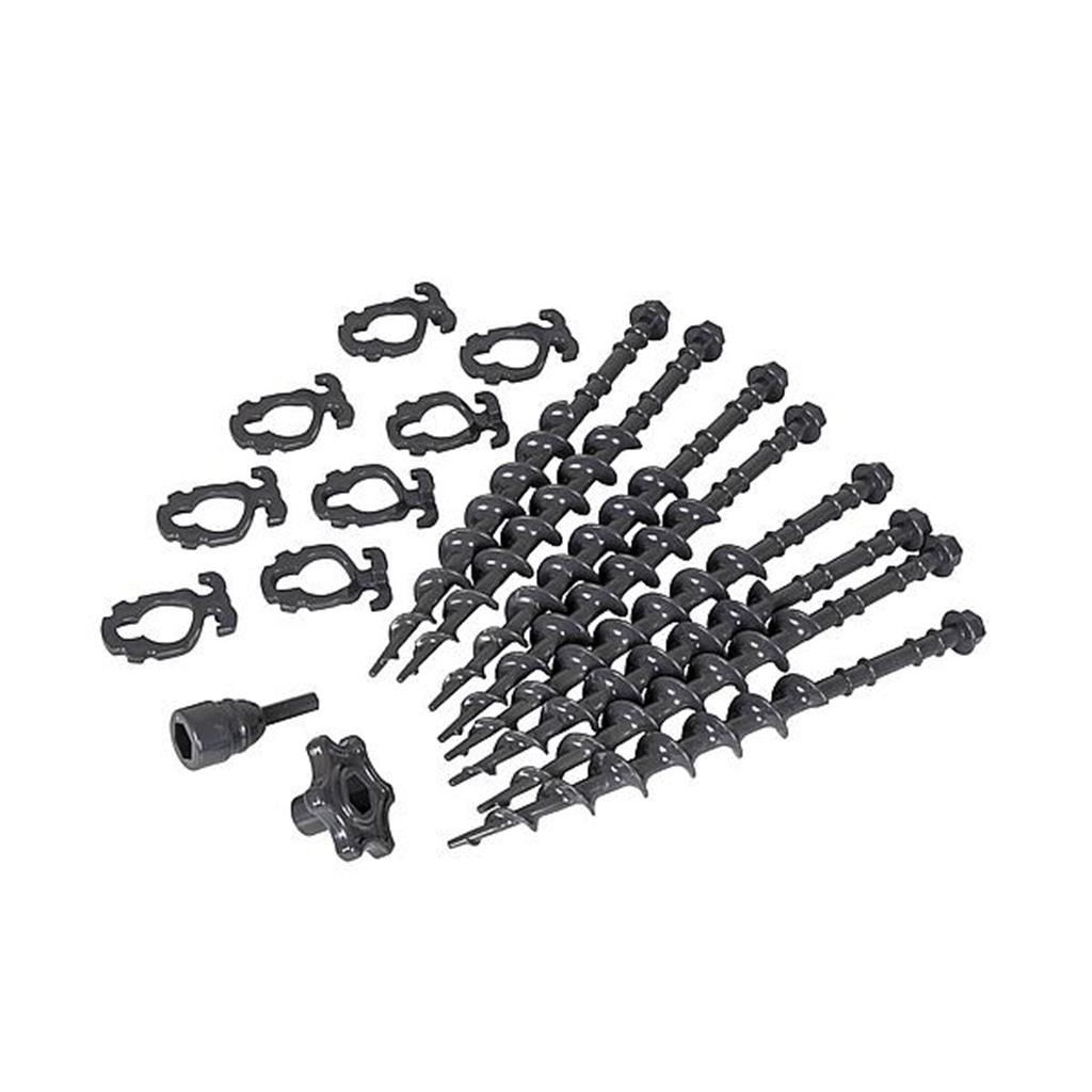 Een 8-delige schroefharingenset van sterk kunststof. Geschikt voor een harde en zachte ondergrond. Geleverd inclusief 8 clips. De haringen zijn met de hand in en uit de grond te draaien maar ook met de boormachine door de 2 meegeleverde boor adapters.