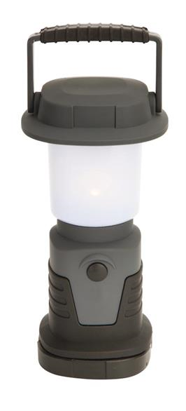Robuuste en compacte tafellamp. Verzorgt een prettig licht door high power LED's met warme lichtkleur en de wit matte kap. De lamp is te gebruiken in drie lichtstanden: 30%, 60% en 100%. Voorzien van een stroeve rubberised behuizing voor meer grip, een inklapbaar hengsel aan de bovenkant en een inklapbare ophanghaak in de bodem. Hierdoor is de lamp staand, hangend en ondersteboven hangend bruikbaar. Werkt op 3x AA batterijen (niet inbegrepen). Brandduur: 60-9 uur. Lichtopbrengst: 13-100 lumen.
