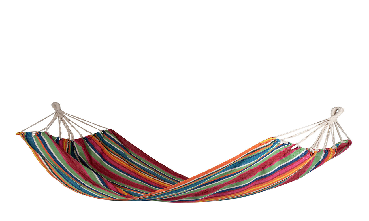 Een vrolijke hangmat. Haalt het échte vakantiegevoel naar boven! Gemaakt van stevig 320gr/m² katoen/polyester. Ligt zeer comfortabel en is gemakkelijk mee te nemen door het draagkoord.