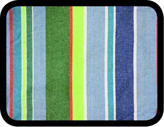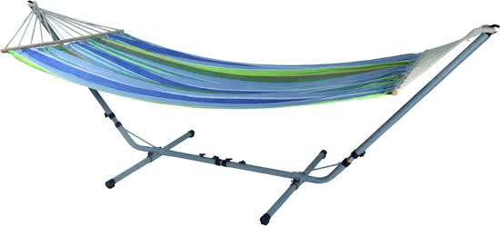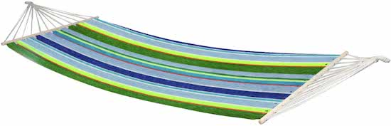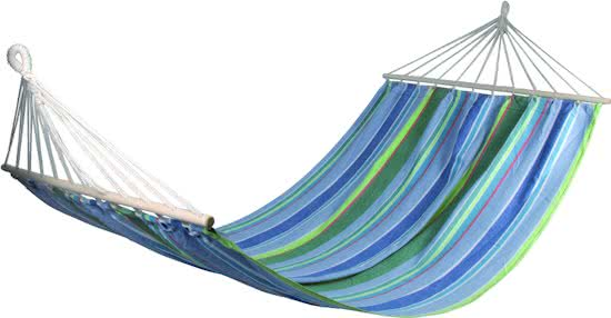 Een vrolijke en zeer stevige hangmat. Haalt het échte vakantiegevoel naar boven! Gemaakt van stevig 320gr/m² katoen/polyester. De hangmat beschikt over een spreidstok aan de uiteinden waardoor de stof volledig open blijft. Maximaal draagvermogen: 200 kilogram.