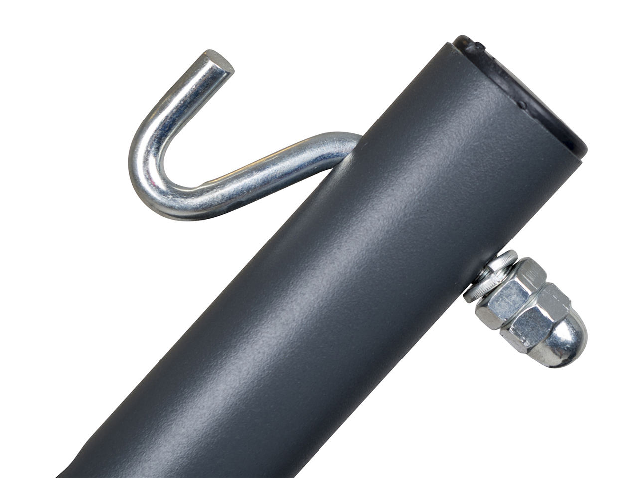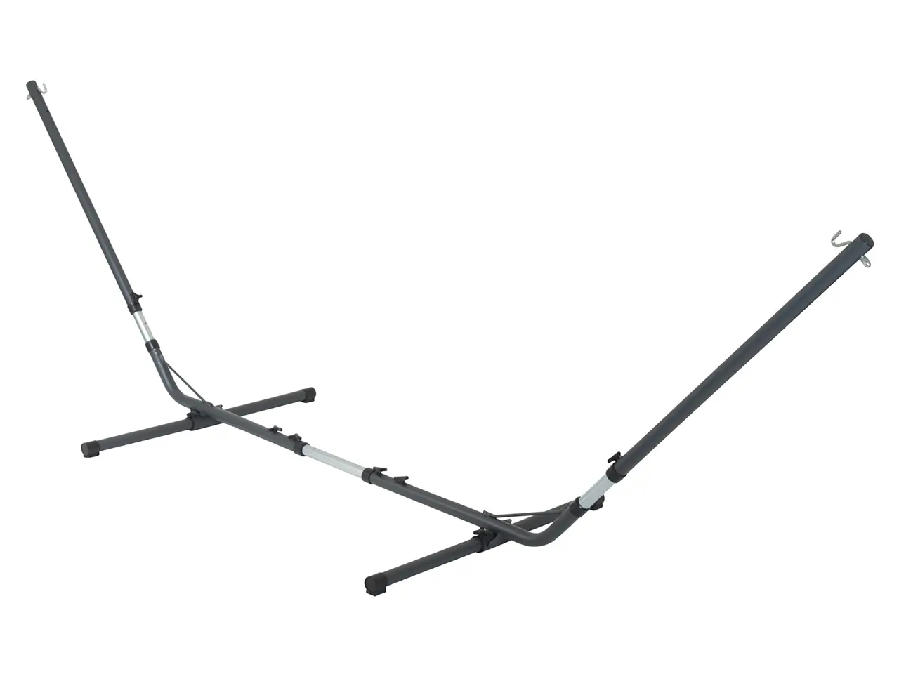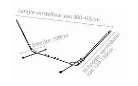 Een stevige universele hangmatstandaard. Een stalen frame om een hangmat in te bevestigen. Doordat het frame zowel in de lengte als in de hoogte te verstellen is, past vrijwel iedere hangmat. Geschikt voor hangmatten met een totale lengte van 300 tot 400 centimeter. De hoogte is verstelbaar van 120 tot 150 centimeter. Maximaal draagvermogen: 150 kilogram.-