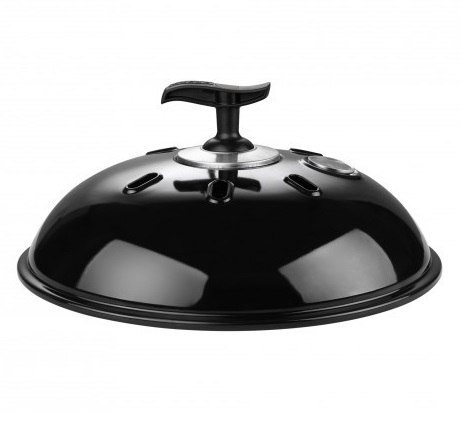 De deksel is voorzien van een een thermometer en een heeft gaatjes aan de bovenkant waardoor er een constante temperatuur ontstaat.