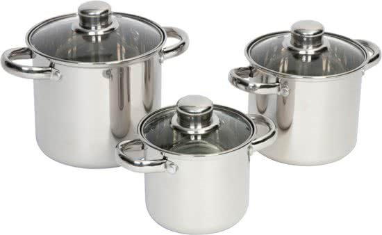 Een 3-delige RVS camping pannenset. Iedere pan beschikt over een stevig glazen deksel. Deze smalle en hoge pannen zijn bij uitstek geschikt voor de beperkte ruimte op gaskomforen. Te gebruiken op de warmtebronnen gas, keramisch en elektrisch.