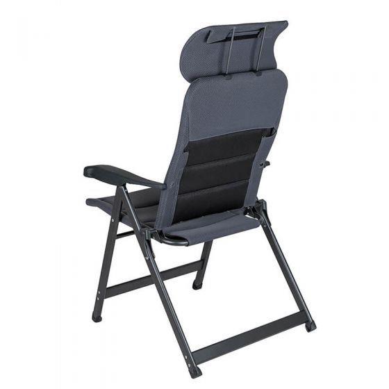 Een zeer luxe compacte standenstoel. Deze stoel biedt maximaal comfort door de in 7 standen verstelbare rugleuning en een traploos verstelbare hoofdstuk. De comfortabele 3-D vulling van deze stof is extra luchtdoorlatend en houdt door de open celstructuur geen vocht vast. Hierdoor is de stoel veel sneller droog dan stoelen met een traditionele schuimvulling. Daarnaast zijn zowel de rugleuning , de zitting en de armleggers ergonomisch gevormd. De stoel is voorzien van een geanodiseerd H-frame voor extra stabiliteit en stevigheid. Ingeklapt is deze stoel zeer compact en daardoor gemakkelijk mee te nemen.