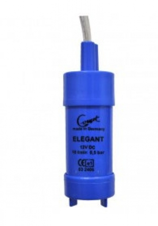 Comet 12V dompelpomp Elegant. Opbrengst 8 ltr p/m. Werkdruk 0,55 bar.Ø 38 x 104 mm. Stroomsterkte max. 2 A. Opvoerhoogte max. 5,5 m. Verbruik 15-24 watt, blauw