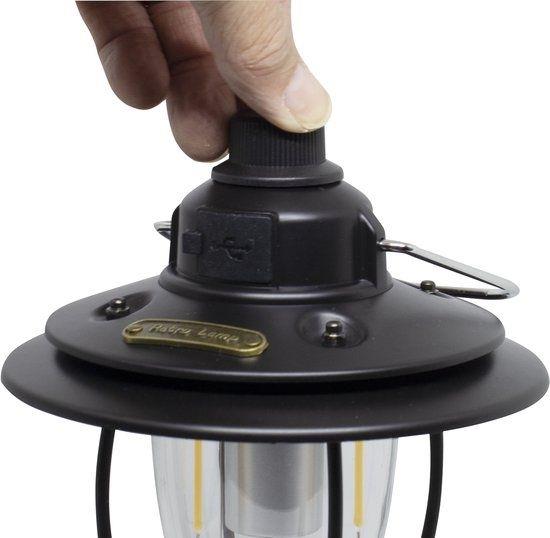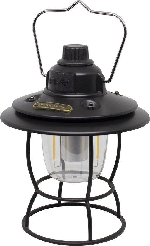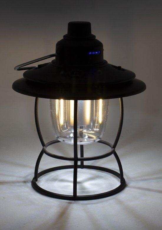 Deze stoere kampeerlamp met een robuust ijzeren framewerk en originele kap is een echte blikvanger. De klassieke uitstraling wordt gecombineerd met modern gemak: oplaadbaar via USB en eenvoudig te bedienen met de draaiknop bovenop. Hiermee schakel je de lamp aan en uit, kies je tussen warm of wit licht en dim je het licht traploos. Een sfeervolle en praktische lamp voor elke buitenplek, met karakter. Inclusief powerbankfunctie.