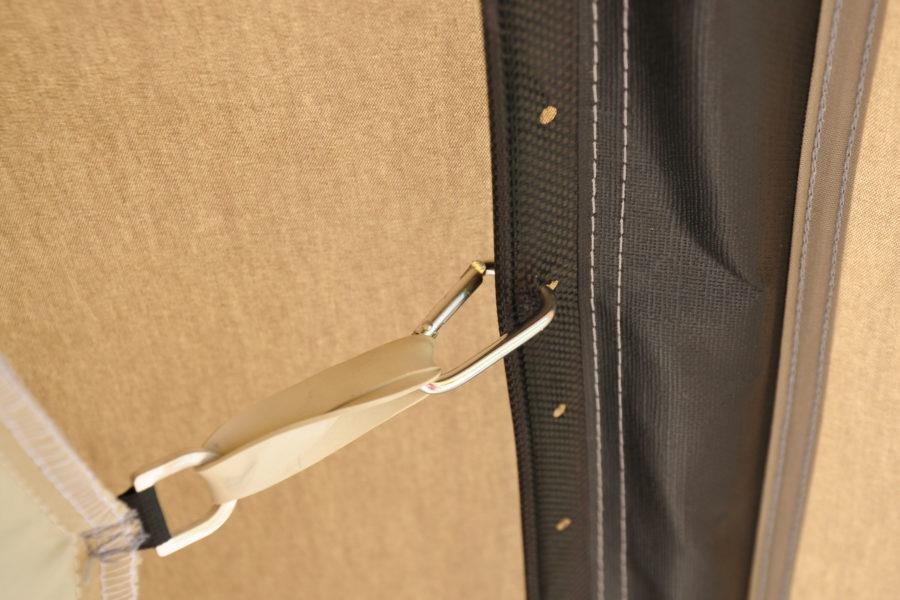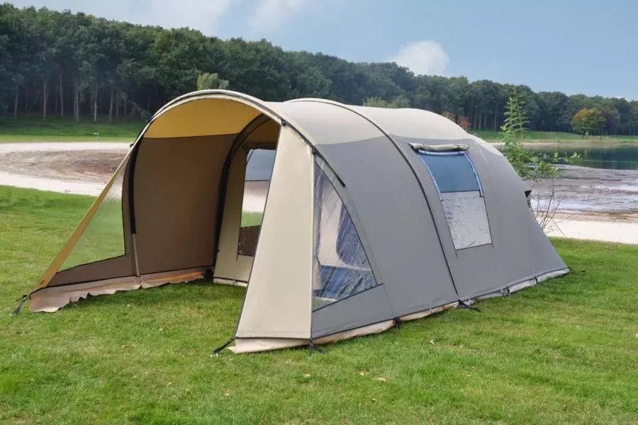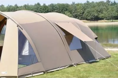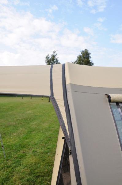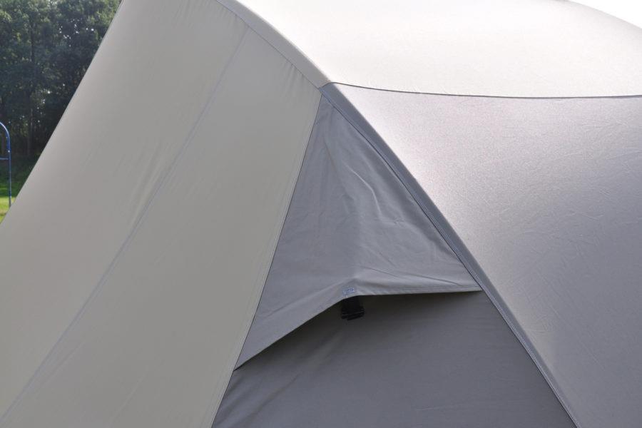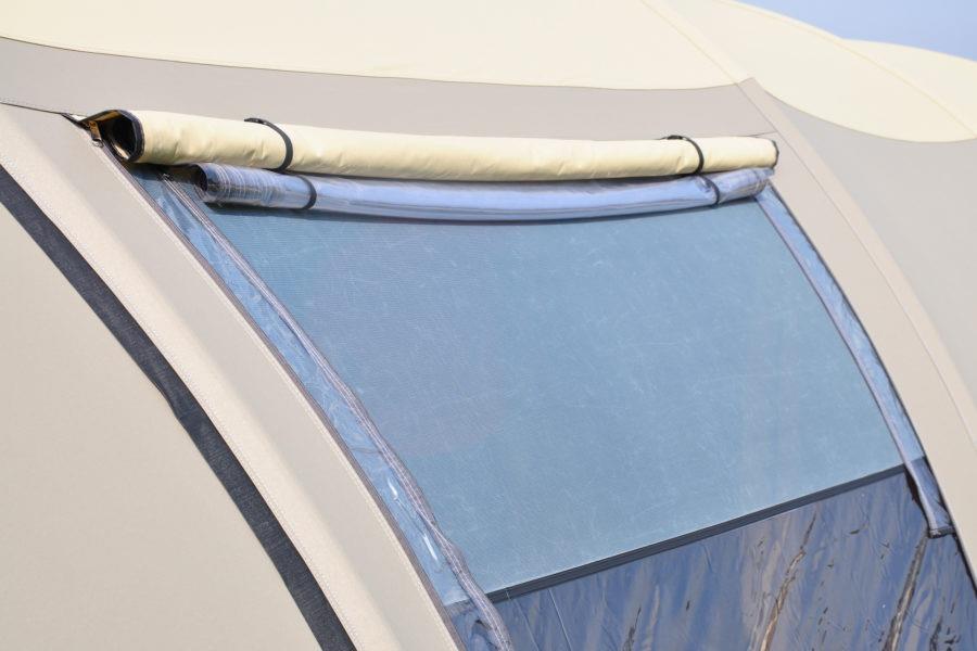 De stormvaste tunneltent wordt in de basis geleverd met een enorme afritsbare luifel, die altijd zorgt voor een riante schaduwplek én het mogelijk maakt om de ventilatie in de voorwand permanent te gebruiken. Het leefgedeelte heeft een comfortabele stahoogte en een flexibele voorwand die je geheel naar de zijkant toe weg te rollen. Zo kun je eenvoudig de luifel bij het leefgedeelte betrekken en genieten van een enorm 'buitenverblijf' met een drempelvrije doorgangen. De heldere ramen zijn voorzien van een luxe ventilatiesysteem en zorgen voor een mooie lichtinval.