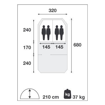 Het inritsbaar kuipgrondzeil is gemaakt van een stevig 480 gr/m2 Bisonyl; een sterk en robuust materiaal dat absoluut waterdicht is. De voorgebogen, dikwandige aluminium boogstokken zijn tot op de millimeter in hoogte verstelbaar met stevige Power-Grip klemmen en zorgen voor een stabiel geheel zonder gebruik te moeten maken van scheerlijnen. Dit zorgt voor een enorme ruimte besparing op de camping, waar een andere gezinstunneltent normaal links en rechts ca. 1.5 meter nodig heeft voor uitspannen van scheerlijnen. U bespaart met een luxe Falco gezinstent dus in totaal 3 meter breedte op de kampeerplek. Een mooie ruimte voor het plaatsen van een bijzettent, schuurtent of uw auto.