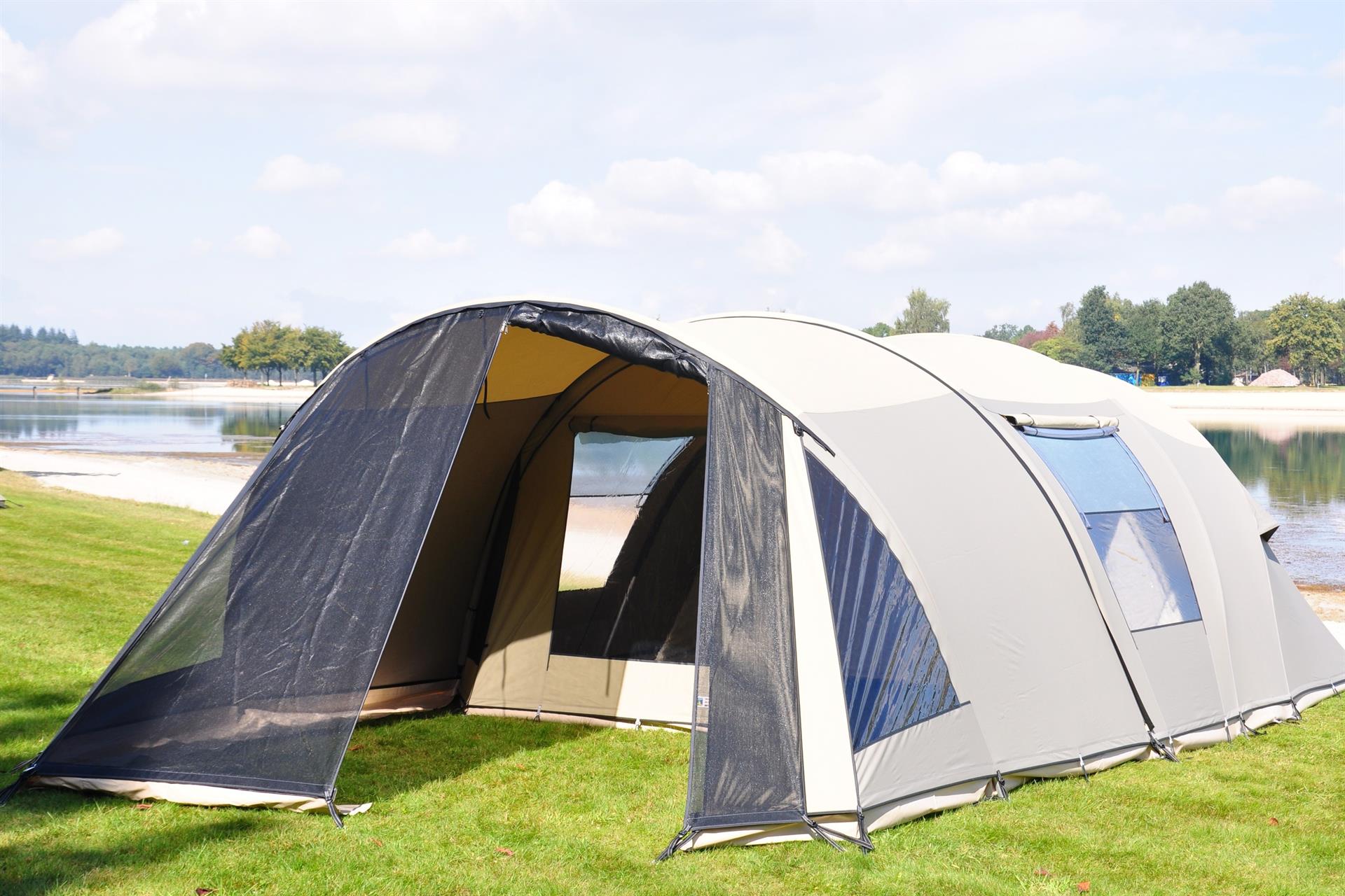 Het gaasfront biedt u enerzijds een comfortabele schaduwplek onder de luifel en geeft u wat extra beschutting tijdens felle zonneschijn. Terwijl een goede luchtdoorstroom het comfortabel houdt onder uw royale luifel, worden vervelende insecten buiten de deur gehouden en geeft de zwarte gaaswand u desgewenst wat extra privacy. Als u het optionele gaasfront heeft geplaatst én dan ook nog de voorwand van de basistent geheel naar de zijkant toe wegrolt, kunt u in uw stormvaste Falco tunneltent genieten van een enorm binnenverblijf met een uitmuntende luchtcirculatie!