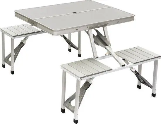 De Bo-Camp picknicktafel is in te klappen tot een compacte koffer en daardoor handig mee te nemen.Vind je losse stoelen en tafels niet handig? Neemt het te veel ruimte in beslag en kies je liever voor iets compacts? Dan is een camping picknicktafel de perfecte keuze! Deze picknicktafel van Bo-Camp bestaat uit één geheel en is eenvoudig uit te klappen tot een ruime picknicktafel die plek biedt aan vier personen.De picknicktafel is voorzien van een inklap beveiliging waardoor de tafel absoluut niet kan inklappen wanneer je er op zit.Zowel het frame, de zitting en het tafelblad zijn gemaakt van lichtgewicht aluminium, hierdoor is de picknicktafel waterproof en hittebestendig. Het zitgedeelte is 41 cm hoog en het tafelblad beschikt over een parasolgat.
