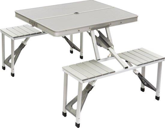 De Bo-Camp picknicktafel is in te klappen tot een compacte koffer en daardoor handig mee te nemen.Vind je losse stoelen en tafels niet handig? Neemt het te veel ruimte in beslag en kies je liever voor iets compacts? Dan is een camping picknicktafel de perfecte keuze! Deze picknicktafel van Bo-Camp bestaat uit één geheel en is eenvoudig uit te klappen tot een ruime picknicktafel die plek biedt aan vier personen.De picknicktafel is voorzien van een inklap beveiliging waardoor de tafel absoluut niet kan inklappen wanneer je er op zit.Zowel het frame, de zitting en het tafelblad zijn gemaakt van lichtgewicht aluminium, hierdoor is de picknicktafel waterproof en hittebestendig. Het zitgedeelte is 41 cm hoog en het tafelblad beschikt over een parasolgat.