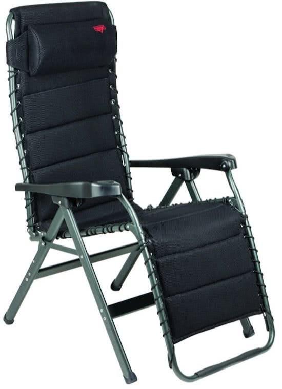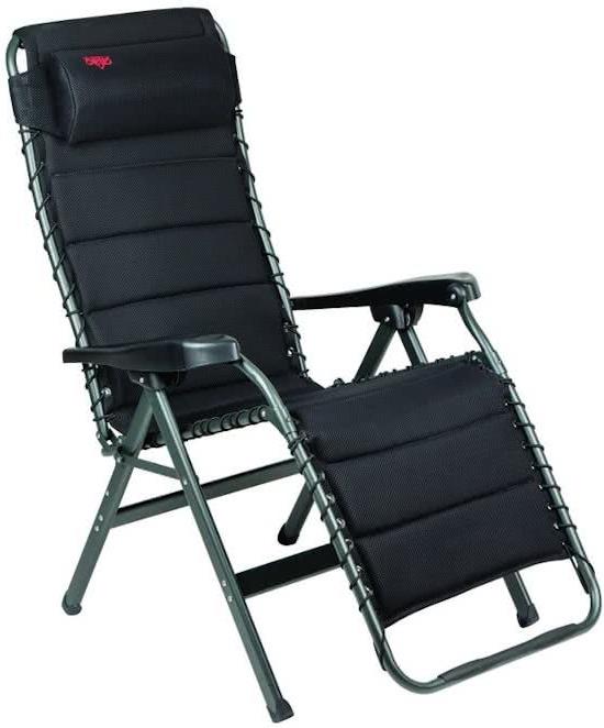 Een zeer luxe en comfortabele relaxstoel met hoofdkussen. Deze stoel biedt maximaal comfort doordat de stoel traploos verstelbaar is en volledig is voorzien van gevoerde stof bevestigd door middel van elastiek. De comfortabele vulling van deze stof is extra luchtdoorlatend en houdt geen vocht vast. Hierdoor kan deze stoel tegen een kleine regenbui en droogt het sneller dan andere stoelen met een traditionele schuimvulling. Daarnaast zorgt de afwerking voor een stijlvolle uitstraling. Zowel de rugleuning als de armleggers zijn ergonomisch gevormd en de stoel is voorzien van een remsysteem om de stoel in iedere gewenste positie te fixeren. De stoel is voorzien van een H-frame voor extra stabiliteit. De stoel heeft een extra brede (54 cm), een extra diepe (55 cm) en een extra hoge zit (50 cm). Ingeklapt is deze stoel zeer compact en daardoor gemakkelijk mee te nemen in de meegeleverde opbergtas.