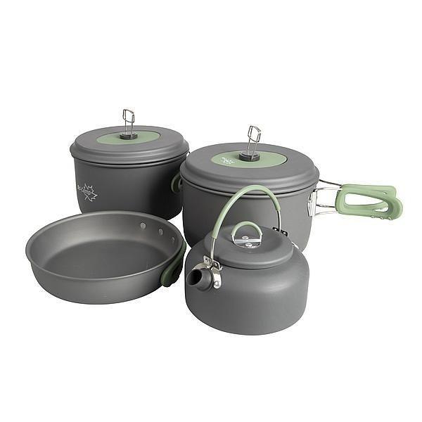 Een complete en ruime 4-delige lichtgewicht kookset. Bestaande uit 2 kookpannen, een koekenpan en een theeketel met een inhoud van 0,8 liter. Bij uitstek geschikt voor outdoor gebruik. De set is voorzien van hittebestendige en in te klappen handgrepen van siliconen. Gemaakt van stevig hard geanodiseerd aluminium waardoor er een verminderde kans is op aanbakken. Geschikt voor gas en benzinebranders. De pannen zijn in elkaar te stapelen waardoor ze compact op te bergen en te vervoeren zijn, inclusief draagtas. Afmetingen kookpannen (Ø): 16,5 en 18,5 cm. Inhoud kookpannen: 1,4 en 2,2 liter. Afmeting koekenpan (Ø): 19 cm. Inhoud koekenpan: 1,25 liter. Inhoud theeketel: 0,8 liter.