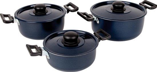 Deze pannenset bestaat uit 3 kookpannen die je kunt gebruiken op gas-, keramische en elektrische kookstellen. De pannen zijn gemaakt van lichtgewicht aluminium. De handgrepen zijn hittebestendig. De pannen zijn vaatwasserbestendig.