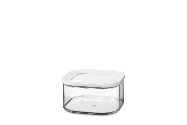 Bewaardoos Modula vierkant 1250 ml, voorzien van een doorzichtige deksel met witte ring. De vierkante doos met afgeronde hoeken heeft een inhoud van 1250 ml en geeft direct zicht op inhoud, ook in de keukenla!