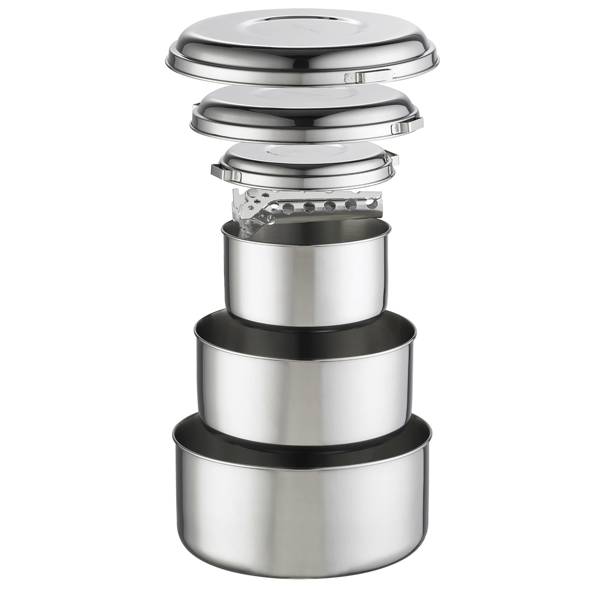 De Alpine™ pannenset met 4 groepen is gemaakt van ongelooflijk duurzaam roestvrij staal en is betrouwbaar bestand tegen zelfs de meest extreme omstandigheden. Het is perfect voor intensief gebruik door frequente reizigers, of door gidsen en instellingen, waar je veel maaltijden zult bereiden tijdens een breed scala aan avonturen.