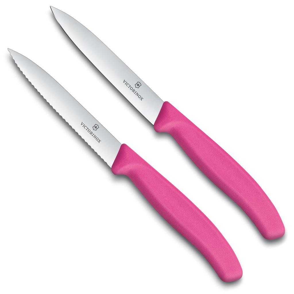 Officemes set bestaande uit twee messen van Victorinox. Kies voor Zwitserse kwaliteit en kleur in huis! De messen hebben roestvrij stalen lemmeten van 10 cm met spitse punt en vlijmscherpe snede, 1 exemplaar is gekarteld en 1 is glad.