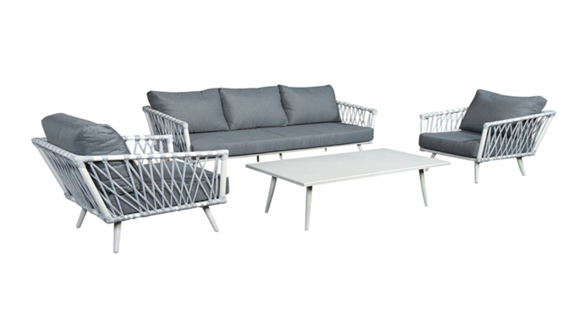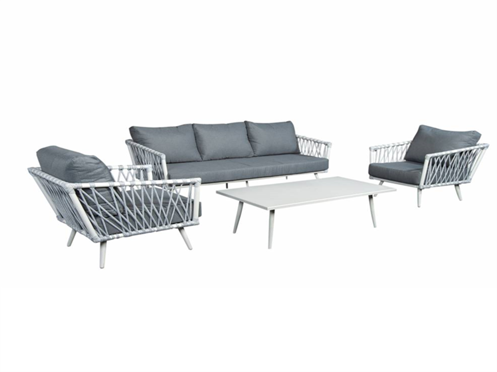 materiaal: grijs aluminium met een zitting en rug van grijs polyester rope, polyester mouse grey kussens.