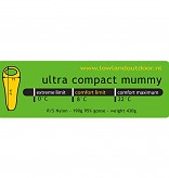 De Ultra compact is en blijft een 1-persoons slaapzak: je kunt er geen twee aan elkaar ritsen. Ultra compact zegt het al: het is zo’n klein pakketje dat je bijna niet kunt geloven dat dat je slaapplek wordt. Met zijn 430 gr. is hij super licht en makkelijk mee te nemen in een dagtourrugzak. Zowel de binnen- als de buitentijk van de Ultra compact mummy slaapzak zijn van Soft Touch Ripstop Nylon gemaakt, heeft een capuchon en is gevuld met 95% ganzendons en houdt je comfortabel warm tot ongeveer een buitentemperatuur van 8°C.