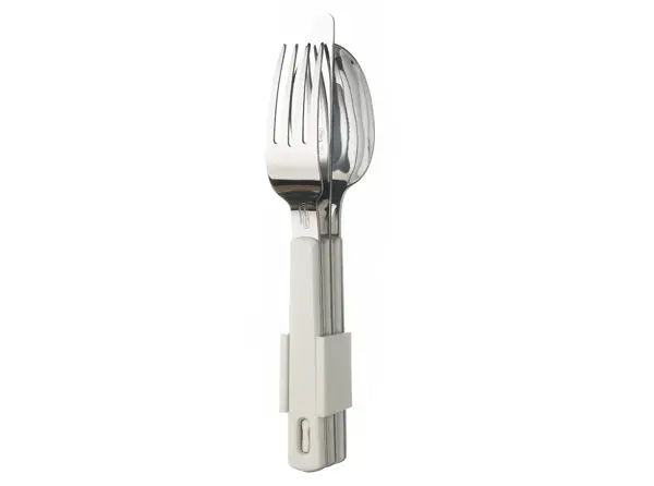 Witte bestekset van Rosti Mepal, bestaande uit een vork, mes en lepel. Een clip houdt dit driedelige kampeerbestek netjes bij elkaar. Super handig!