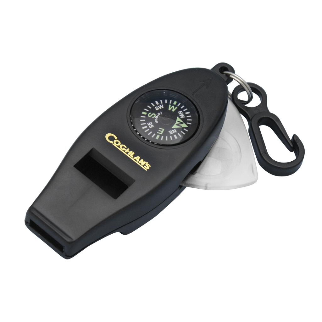 Een multifunctionele fluit met 4 functies zoals fluit, thermometer, loep en kompas.