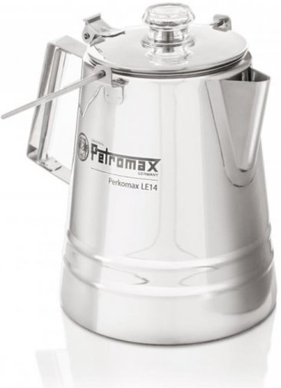 Deze degelijke percolator is geschikt om een lekker kopje koffie of thee te maken boven verschillende warmtebronnen. Bijvoorbeeld boven een kampvuur, extra makkelijk door de beugel waar je deze percolator aan op kunt hangen. Ook geschikt voor gebruik binnenshuis! Voorzien van een glazen knop zodat je het proces kunt controleren. Grote inhoud, maar liefst 14 koppen.