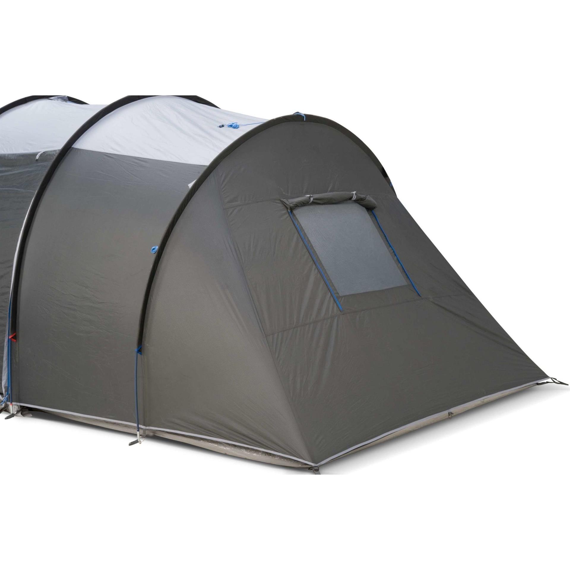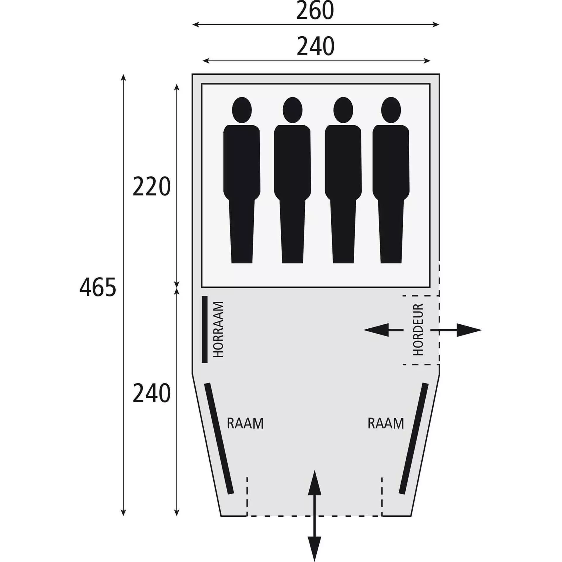 De Safarica Blackhawk 260 is een fijne bijzettent met royale voorbouw en zijingang! Deze biedt voldoende ruimte voor 2-4 personen met een slaapcabine van 220 cm bij 240 cm. U heeft er zelfs wat ruimte over om bij het hoofd- of voeteneinde bagage op te bergen. Daarnaast heeft de voorbouw met een diepte van 240 cm en kunt u deze op meerdere manieren betreden doordat deze een voor- en zijingang heeft. De gehele tent heeft een lengte van 465 cm en een breedte van 260 cm. Met een hoogte van 180 cm in de slaapcabine en 200 cm in de voorbouw heeft u ook voldoende bewegingsruimte. U kunt er zelfs rechtop staan tenzij u erg lang bent. De leefruimte heeft niet alleen een fijne zijingang, maar ook grote raampanelen voor een mooie lichtinval. De zij-ingang is zelfs voorzien van een afsluitbaar gaaspaneel voor een nog betere ventilatie zonder dat u vervelende insecten binnen laat. De Blackhawk 220 is leverbaar in de kleurcombinatie antraciet/grijs. Het tunnelontwerp maakt de bijzettent erg gebruiksvriendelijk en overal gemakkelijk te plaatsen. Als u niet zo veel ruimte nodig heeft of gewoon een kleinere tent wil, dan is de Safarica Blackhawk 220 tent wellicht iets voor u. Mocht u nou liever een grotere aanritsbare luifel willen bij uw tent, dan kunt u kijken naar de Safarica Blackhawk 300 Deluxe. Met de Safarica Blackhawk 260 heeft u in ieder geval een praktische en ruime bijzettent voor allerlei kampeeruitjes!