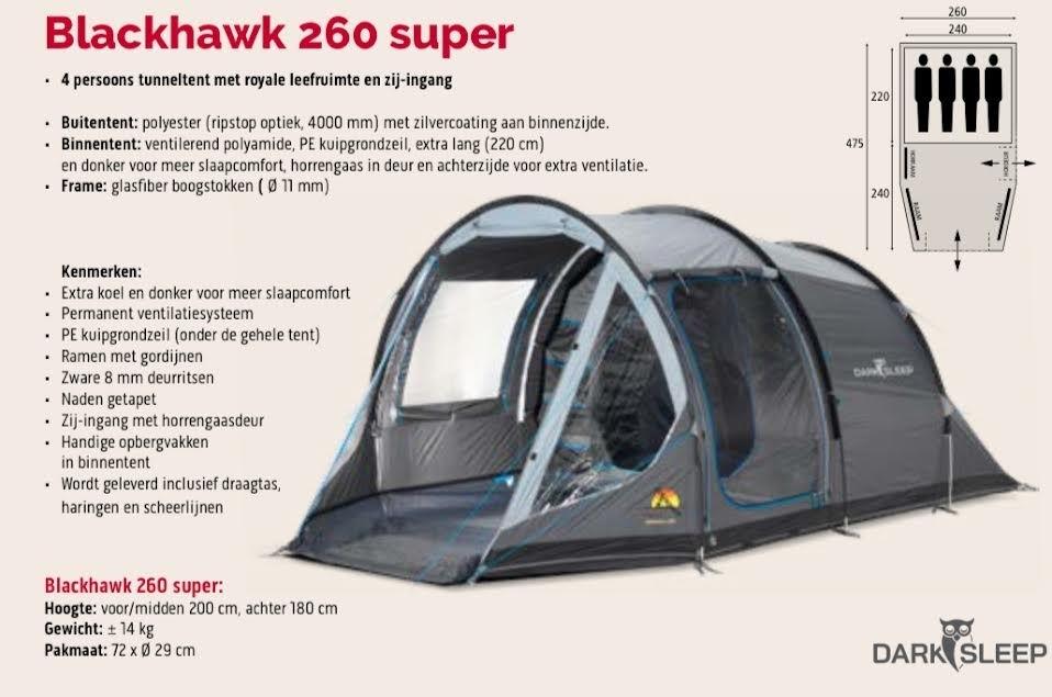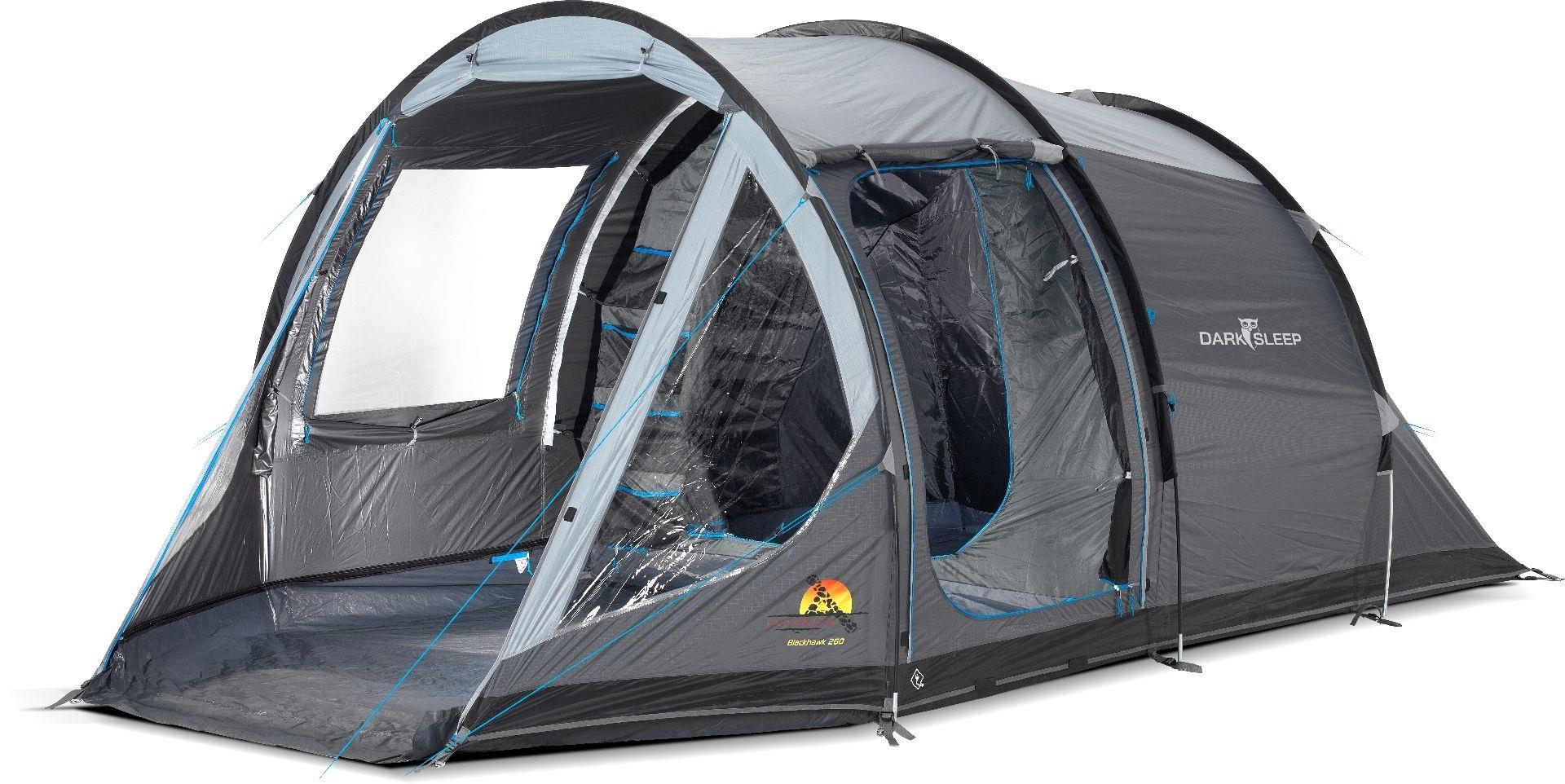 De Safarica Blackhawk 260 Super DarkSleep tunneltent is een royale familietent voor vier personen en heeft naast een vooringang ook een zij-ingang. Deze tunneltent van Safarica is gemaakt van donker DarkSleep materiaal voor een betere nachtrust op de camping of bij een festival.
