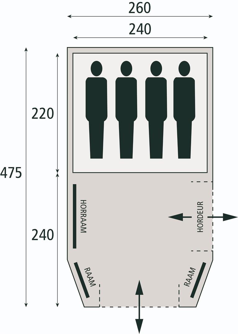In de leefruimte van 240 bij 260 kunt u met gemak een paar stoelen en een tafel kwijt, naast uw andere bagage, en deel de tent naar wens in door te kiezen of u van de voordeur of zij-ingang gebruik maakt. Een ruime slaapcabine van 220 bij 240 cm biedt voor vier volwassenen slaapruimte.