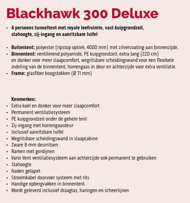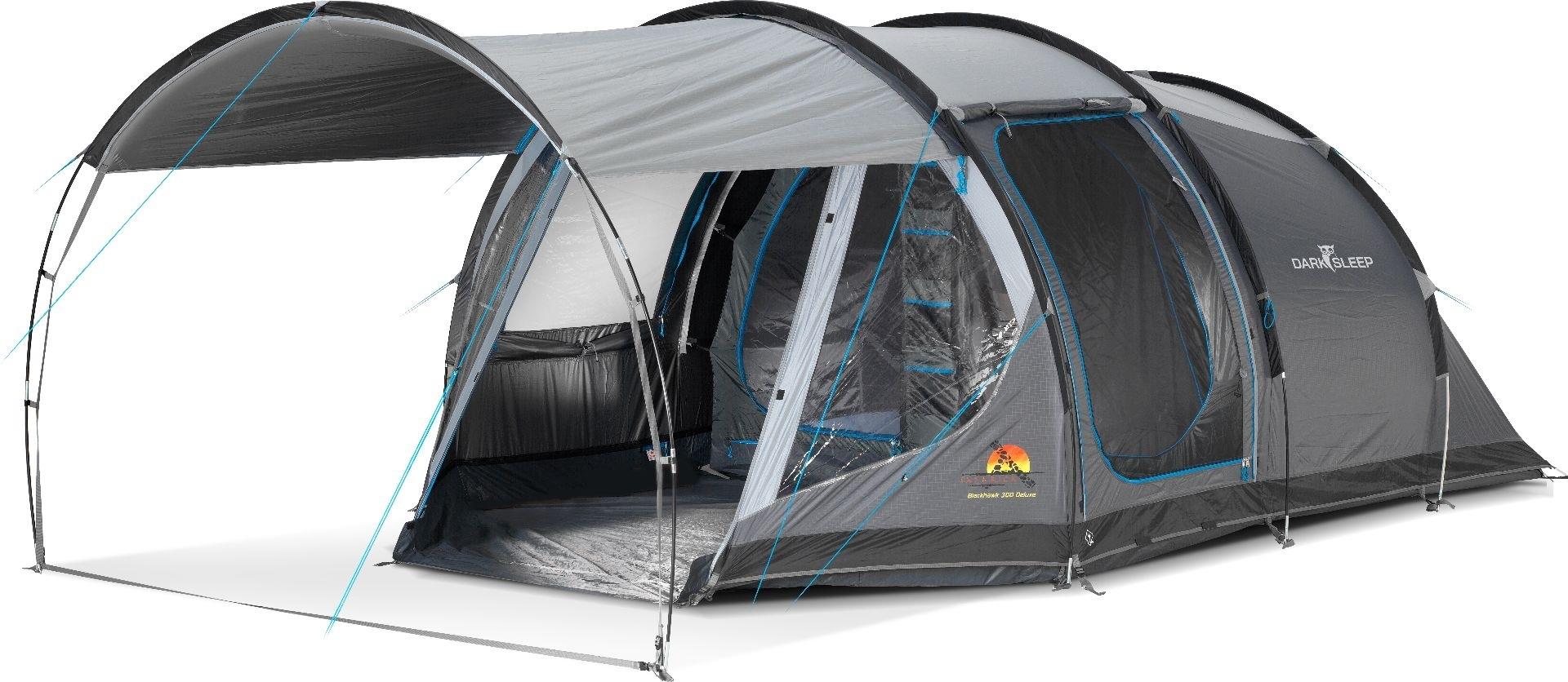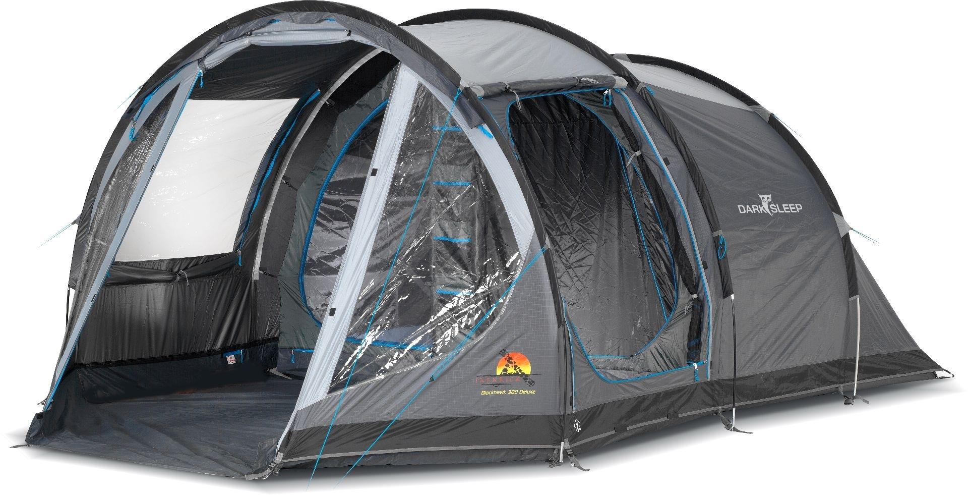 De Safarica Blackhawk 300 Super DarkSleep tunneltent is een royale familietent voor vier personen en heeft naast een vooringang ook een zij-ingang. Deze tunneltent van Safarica is gemaakt van donker DarkSleep materiaal voor een betere nachtrust op de camping of bij een festival.