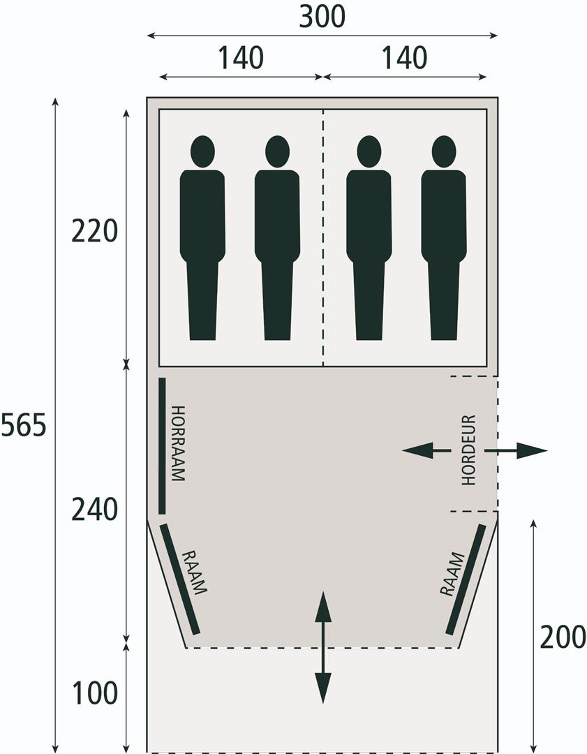 In de leefruimte van 240 bij 300 kunt u met gemak een paar stoelen en een tafel kwijt, naast uw andere bagage, en deel de tent naar wens in door te kiezen of u van de voordeur of zij-ingang gebruik maakt. Een ruime slaapcabine van 220 bij 260 cm biedt voor vier volwassenen slaapruimte.