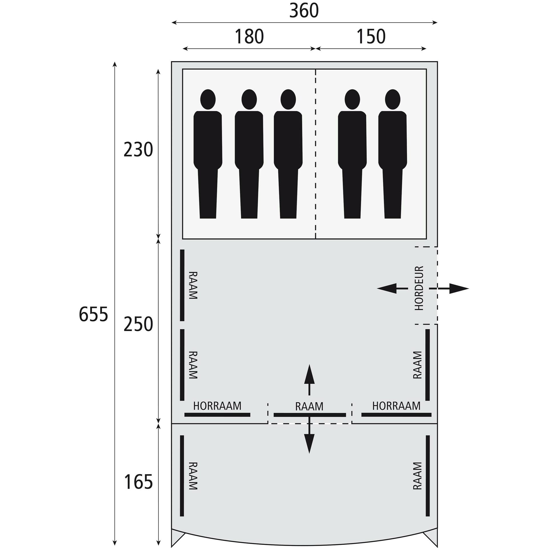 De Safarica Indian Hills 360 is ruim en flexibel in te delen. Deze tent heeft namelijk een wegritsbare scheidingswand in de slaapcabine en een wegrolbare wand in het leefgedeelte. Zo kunt u de luifel direct bij de voorbouw betrekken als u wilt. Daarnaast heeft de tent een functioneel ingedeeld leefgedeelte met comfortabele hoogte van 210 centimeter. Voor extra comfort biedt het leefgedeelte voldoende ruimte om te relaxen en heeft de tent een mooie lichtinval door de grote raampartijen. Deze ramen zijn aan de binnenzijde traploos te verduisteren met een polyester gordijn met ritsen. De hele tent heeft een afmeting van 655 cm bij 360 cm. De slaapcabines bieden voldoende ruimte voor 2 en 3 personen met de scheidingswand ertussen. Deze hebben beide namelijk een lengte van 230 cm en de ene heeft een breedte van 180 cm en de andere een breedte van 150 cm. De voorbouw biedt veel ruimte met zijn diepte van 250 cm en de luifel kan hier nog een diepte van 165 cm aan toevoegen. Zo geniet u dus in de voorbouw van een ruimte met een breedte van 360 cm en een lengte van 250 cm die u nog kunt uitbreiden door de tussenwand weg te rollen. Dankzij de luifel heeft u altijd een droge inloop en regent het niet binnen. Zo heeft u voldoende ruimte om tot rust te komen gedurende de nacht en overdag heerlijk te relaxen in de Safarica Indian Hills 360.