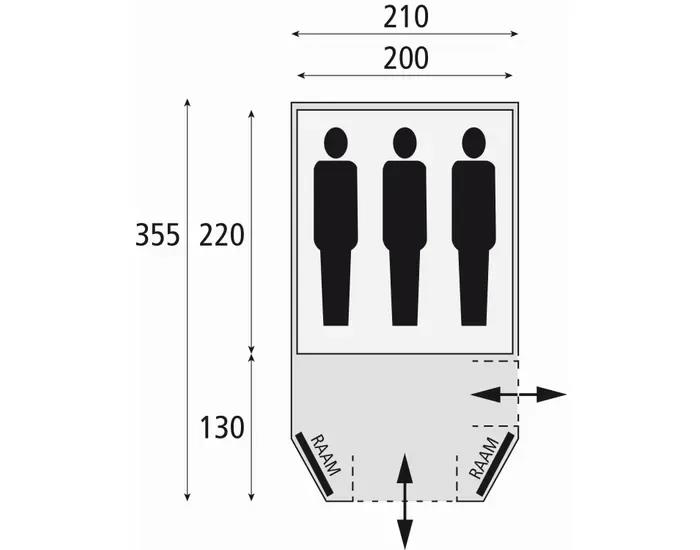 De efficiënte indeling zorgt ervoor dat u met drie personen comfortabel kunt slapen en toch nog leefruimte (130 – 210 cm) overhoudt.
