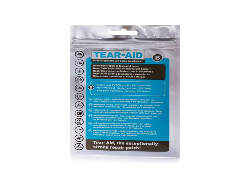 Repareert gaten en scheuren in producten van PVC en vinyl permanent. Dit product kan zelfs onder water gebruikt worden. Ideaal voor PVC tentramen, PVC grondzeilen, (opblaas-) boten, zwembaden, zwembanden, opblaasbaar speelgod, PVC zonneschermen en parasols, vinyl regenjassen en tassen. Tear-Aid B is extreem sterk, water- en luchtdicht, zeer elastisch, verkleurt niet en droogt niet uit.